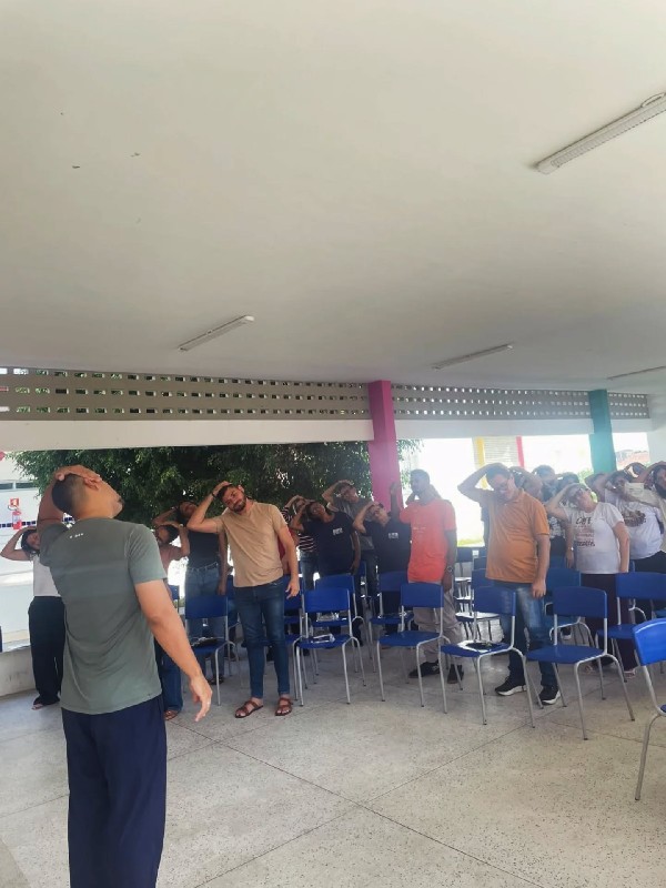 Encerrando a ação e reforçando a proposta de cuidado prático com o corpo, o educador físico Anderson Garcia conduziu exercícios de alongamento voltados para todos os profissionais da unidade escolar.