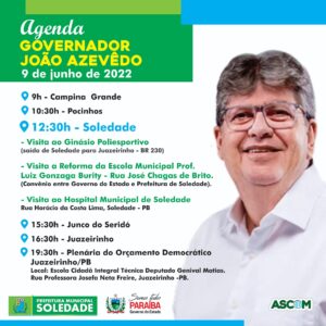 Governador João Azevêdo visitará hoje (9) obras públicas em Soledade