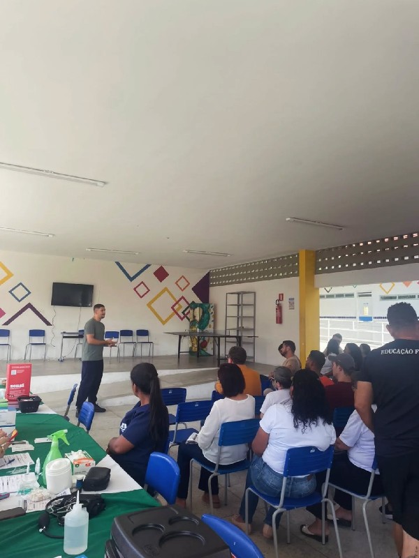 Realizada pela Vigilância em Saúde, com o apoio de profissionais da equipe multidisciplinar, da Atenção Básica e do CAPS, o momento foi voltado para professores, coordenadores, auxiliares de serviços gerais, cozinheiros e porteiros.